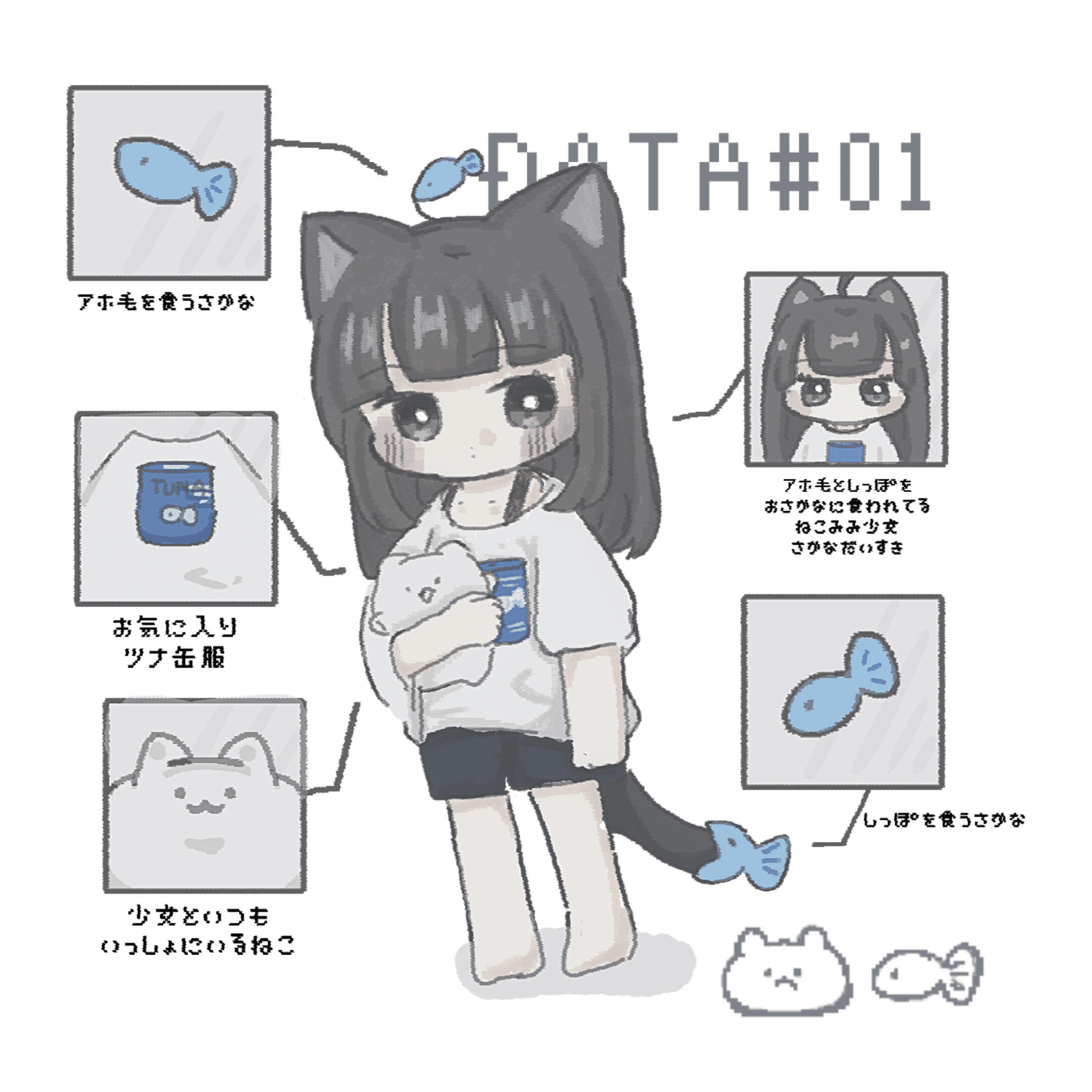 アホ毛と尻尾を魚に食べられている猫耳少女。 魚が大好物。 小さいねこといつも一緒にいる。 「CAT GIRL」は名前ではない。 少女には名前はあるが、誰もその名前を知らない。 知っているのは少女自身とねこのみ。そのため、少女を示す言葉として「CAT GIRL」「猫耳少女」という言葉が用いられる。